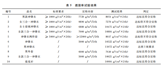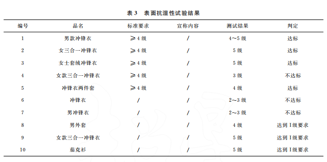 本文最終的判定是結(jié)合 GB/T32614—2016《戶外運(yùn)動服裝 沖鋒衣》中面料功能性要求和產(chǎn)品銷售時的吊牌宣稱進(jìn)行。達(dá)標(biāo)是指符合沖鋒衣的合格品 標(biāo) 準(zhǔn) 要 求,反 之 則 不 符 合。10 件 樣 品中,只有5件達(dá)標(biāo),且只有3件是符合吊牌宣稱內(nèi)容。其中,標(biāo)示了 GB/T32614—2016的沖鋒衣,有3件達(dá)標(biāo),合格率為60%。近年來,監(jiān)管部門的抽查合格率一般在80%左右。這次比較試驗(yàn)合格率偏低的原因可能是樣品量較少,樣品的價格區(qū)間比較集中,且考核了接縫處的靜水壓。值得注意的是有2件沒有標(biāo)示 GB/T32614—2016的外套,其性能都符合標(biāo)準(zhǔn)要求。此外,銷售方對靜水壓的宣稱都偏高,有3件達(dá)標(biāo)了卻不符合自身的宣稱內(nèi)容。沖鋒衣 GB/T32614—2016標(biāo)準(zhǔn) 中 I級 對 靜 水 壓 的 要 求 也 只是:面料≥50kPa和面料接縫處≥50kPa,銷售 方卻往往宣稱100kPa,甚至達(dá)150kPa,而且也沒有充分考慮到面料接縫處靜水壓值會相對偏小的現(xiàn)實(shí)。需要警 醒 的 是,5 件 標(biāo) 示 了 GB/T32614—2016的沖鋒衣其綜合宣傳都不符合規(guī)定,存在執(zhí)行標(biāo)準(zhǔn)標(biāo)注正確卻夸大宣傳的嫌疑。