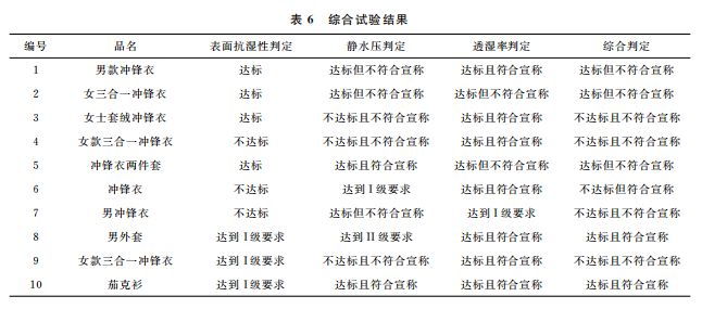 表面抗?jié)裥浴㈧o水壓和透濕率綜合統(tǒng)計(jì)的測試結(jié)果見表6。