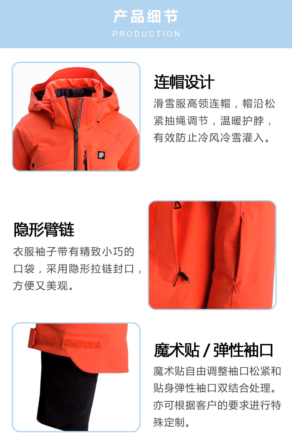 • 連帽設計:滑雪服高領連帽,帽沿松緊抽繩調節,溫暖護脖,有效防止冷風冷雪灌入。